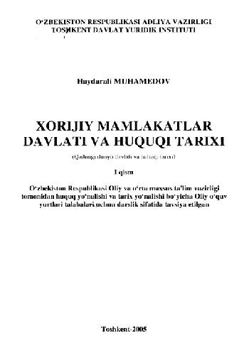 Ushbu darslik Xorijiy mamlakatlar davlati va huquqi tarixining birinchi davri - qadimgi dunyo davlati va huquqi tarixiga bag'ishlanib, unda mazkur o'quv kursi o'rganadigan masalalar doirasi, ularga yondashish usullari, uning vazifasi, davrlarga bo'lib o'rganilishi, ahamiyati, ijtimoiy va huquqiy fanlar tizimida tutgan o'rni va ular bilan o'zaro aloqadorligi, qadimgi Sharq va antik dunyo mamlakatlarida davlat va huquqning kelib chiqishi, rivojlanishi sabablari, xususiyatlari, ijtimoiy va davlat tuzumi, huquqining asosiy belgilari kabi masalalar yoritilgan.